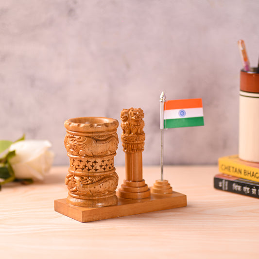 Wooden Color Pen Stand Ashok Stambh & Flag for Child Desk, Office Use and Gifts