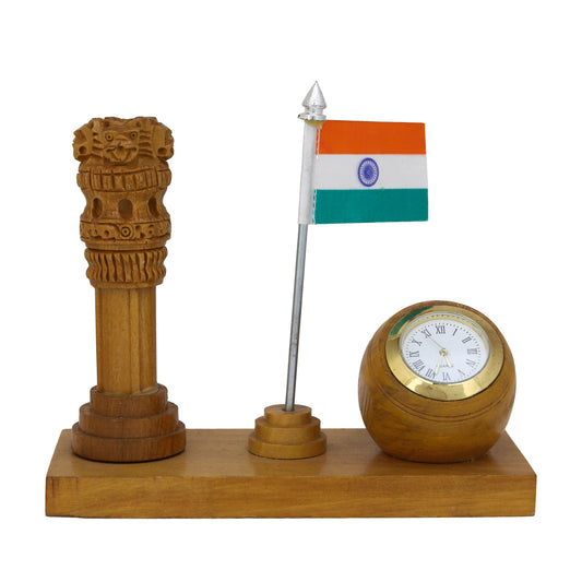 Wooden Stylish Ashoka Stambh Stand with Clock & Flag Elegant Desk Organizer | Patriotic Gift | Office & Home Décor