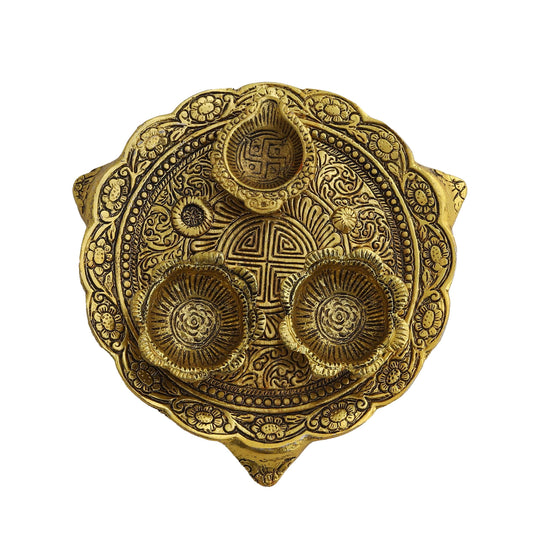 Metal Pooja Thali with Diya, Swastik & Floral Design Traditional Pooja Plate for Festivals, Rituals & Gifting