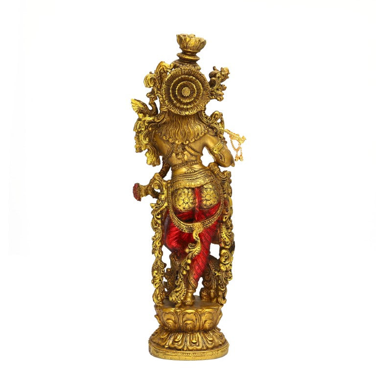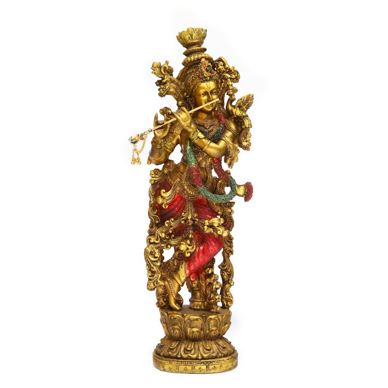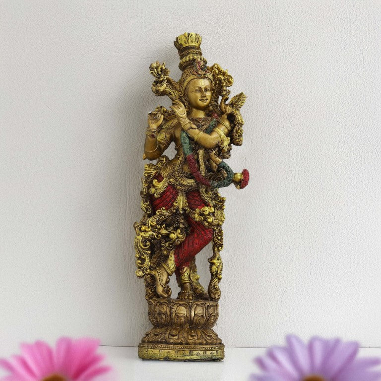 Depicting Lord Krishna in his most captivating form, our Lord Krishna Idol Sculpture adds an auspicious charm to your home. This sculpture is cast in resin and has a copper finish, giving it its luxe appeal. It has been crafted with the intricate detailing of local artisans. This 'Krishna-playing a flute' idol makes for the perfect addition to any religious setting or home decor collection. Place our Lord Krishna sculpture anywhere in your home to invite peace, wellness and joy into your abode.