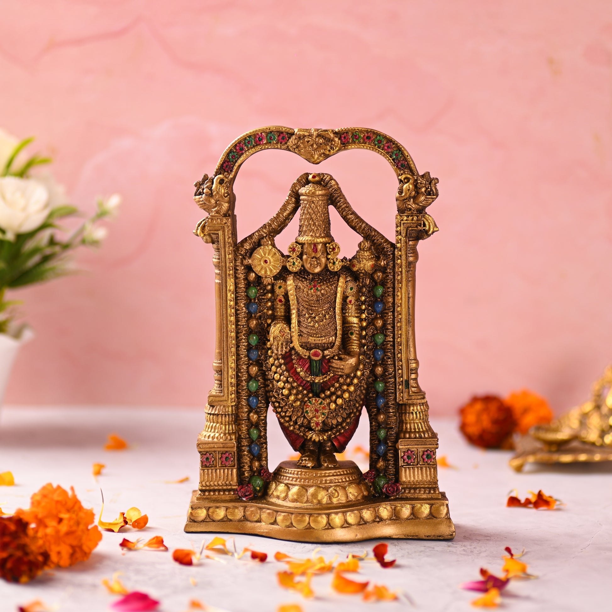 Bask in the divine aura of Lord Tirupati Balaji with our Tirupati Balaji Murti. This captivating idol is made from premium resin and features intricate details that add an auspicious charm to your home. With its divine energy, it brings a sense of peace, prosperity, and positivity into your life. Crafted with the utmost care by skilled artisans, this god idol is a symbol of spiritual bliss and devotion.